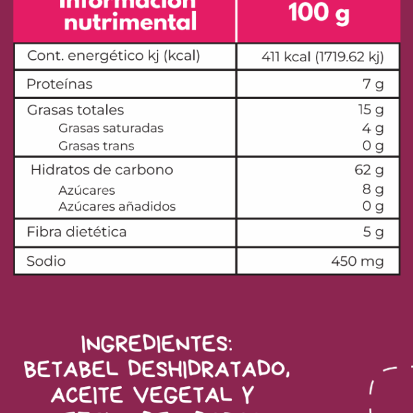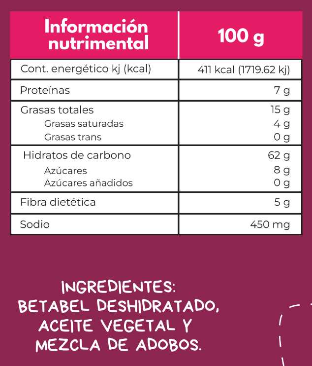 Betabel natural deshidratada, chiles secos, sazonadas con sal.