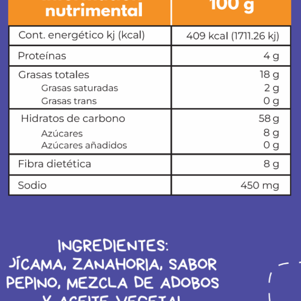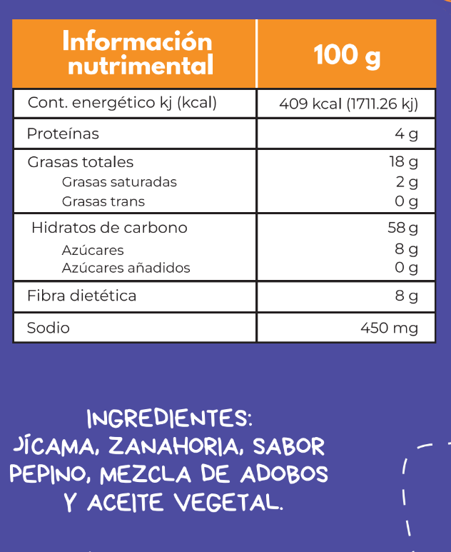 Chips de jícama, sabor pepino y zanahoria natural deshidratada, chiles secos, sazonadas con sal.