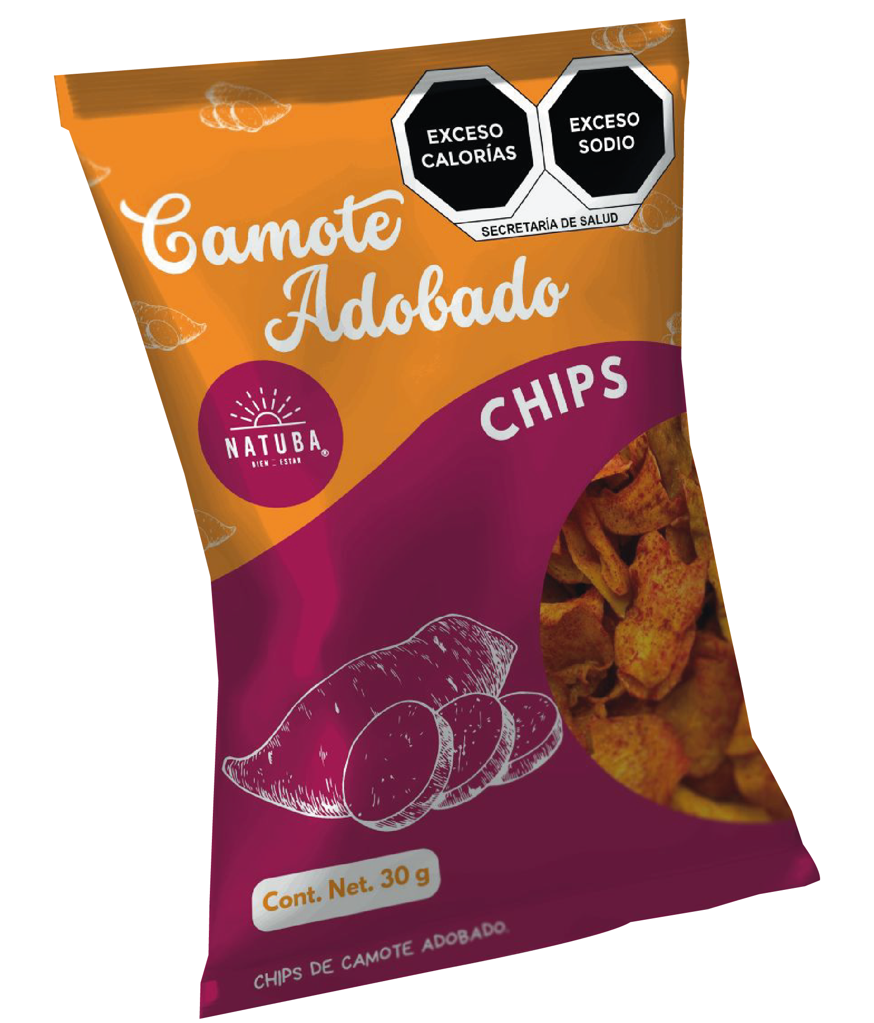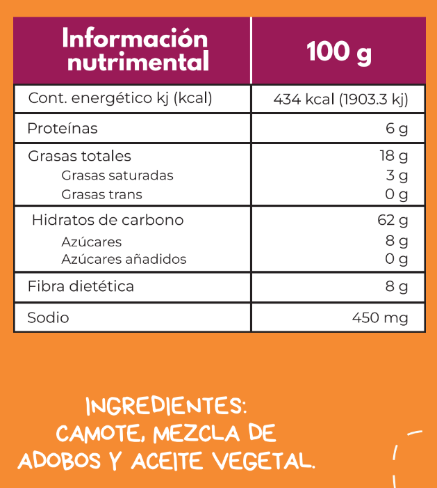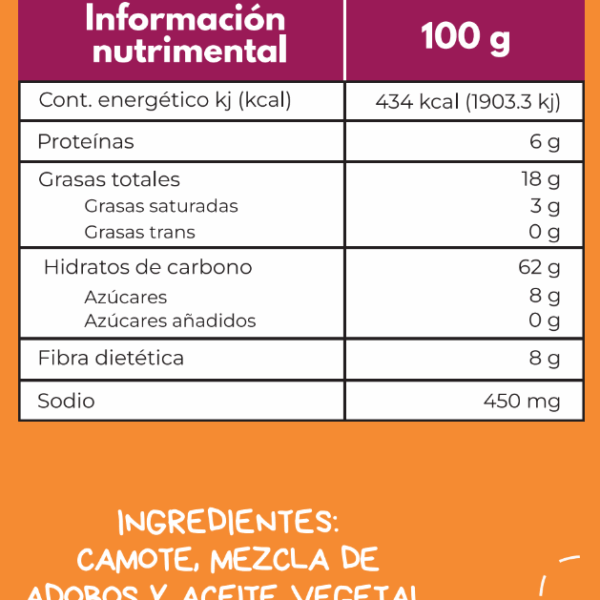 Camote natural deshidratada, chiles secos, sazonadas con sal.