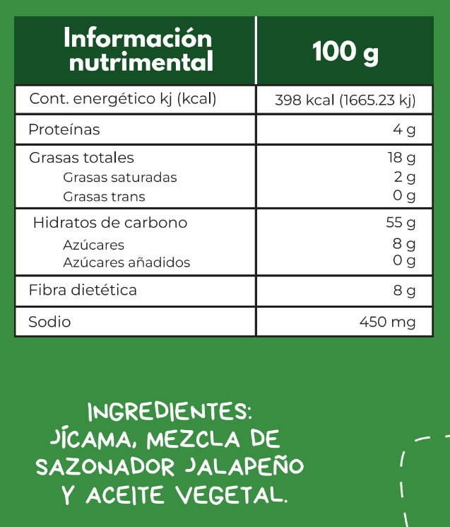 Jícama natural deshidratada, chiles secos, sazonadas con sal.