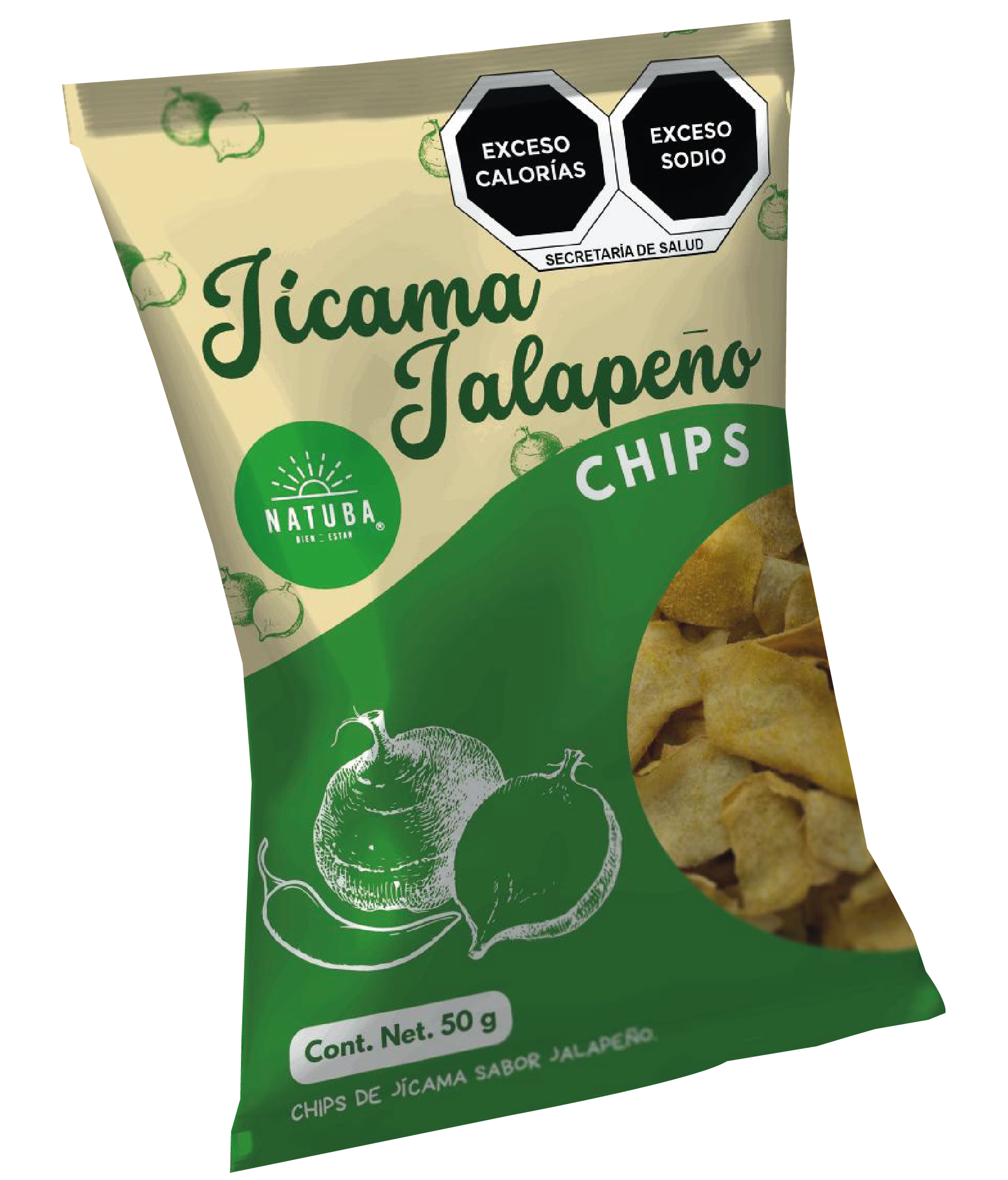 Chips de jícama, sabor pepino y zanahoria natural deshidratada, chiles secos, sazonadas con sal.