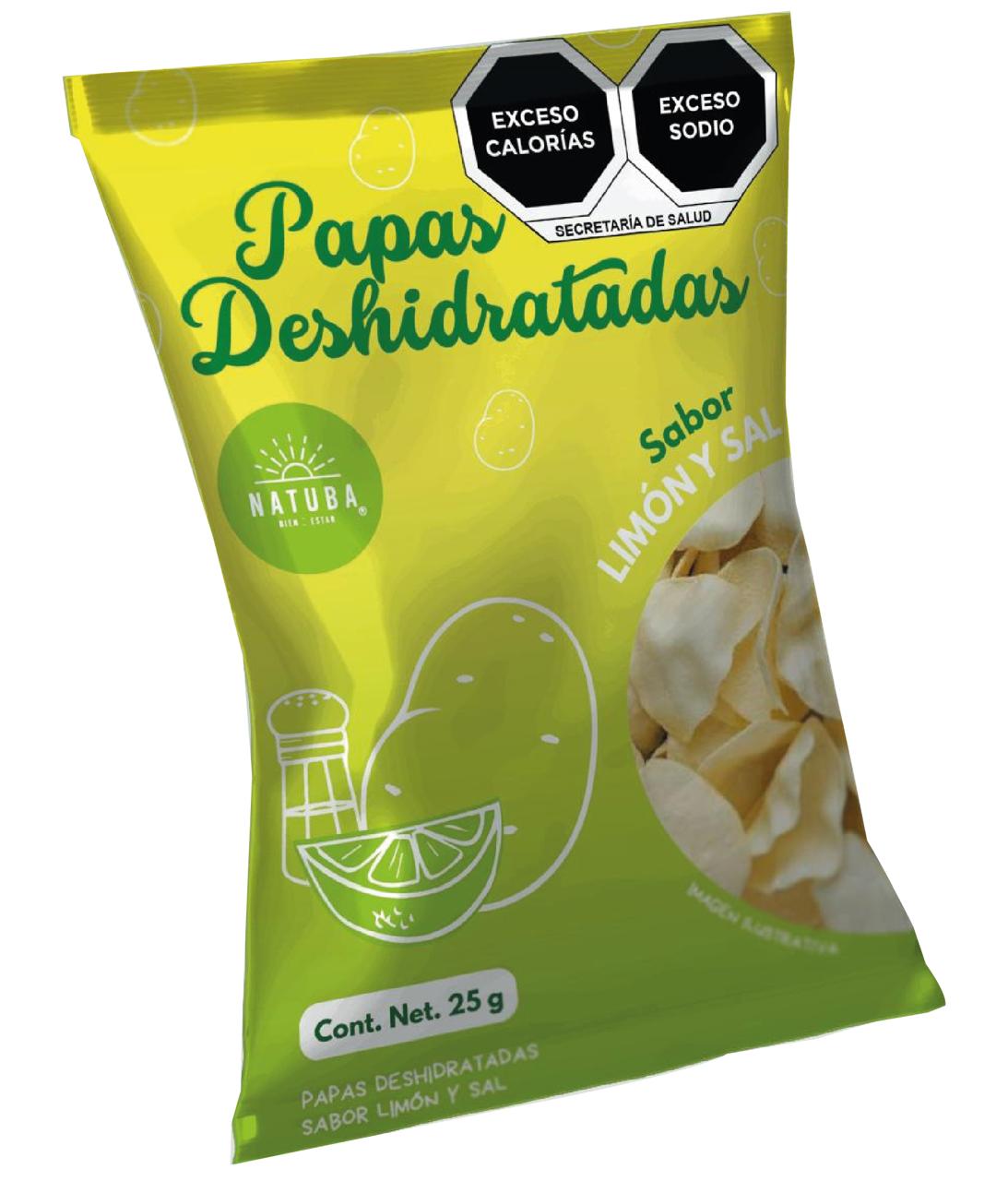 Hojuelas de papas deshidratadas sabor sal y limon, presentacion de 25 gramos.