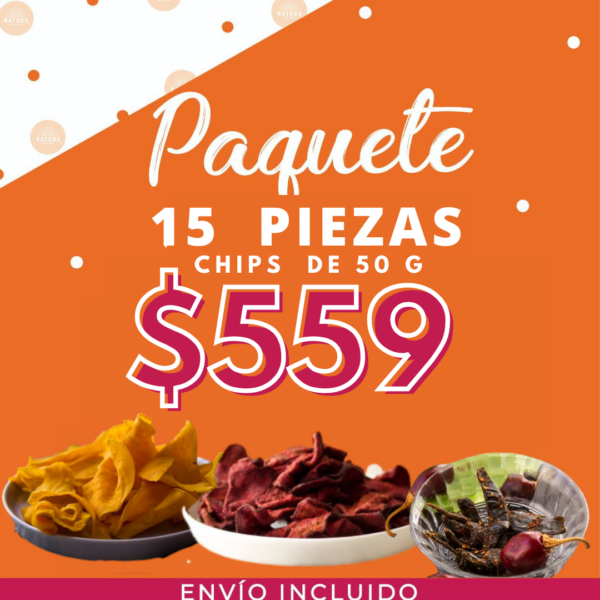 Paquete de 50 piezas. Aplica sólo para Chips deshidratadas de 50g. Si deseas, puedes reemplazar algunas bolsas de chips por Mix de Frutos secos de 50g.