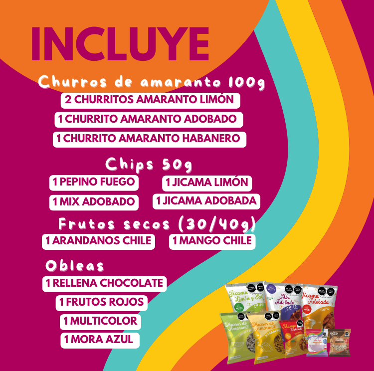 Paquete de 30 piezas. Aplica sólo para Chips deshidratadas de 50g. Si deseas, puedes reemplazar algunas bolsas de chips por Mix de Frutos secos de 50g.