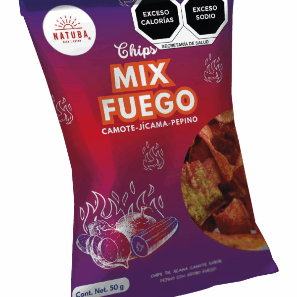 MIX FUEGO: Chips de jícama fuego, camote adobado y sabor pepino fuego.